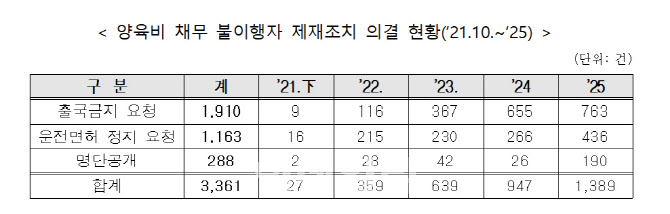 특히 명단공개는 전년 대비 약 7.3배 급증했다. 이는 올해 7월부터 사전 소명 기간을 기존 3개월에서 10일 이상으로 대폭 단축한 제도 개선의 효과로 풀이된다. 이 같은 정책 변화의 결과 양육비 이행률도 2021년 38.3%에서 올해 10월 기준 47.5%까지 상승했다.